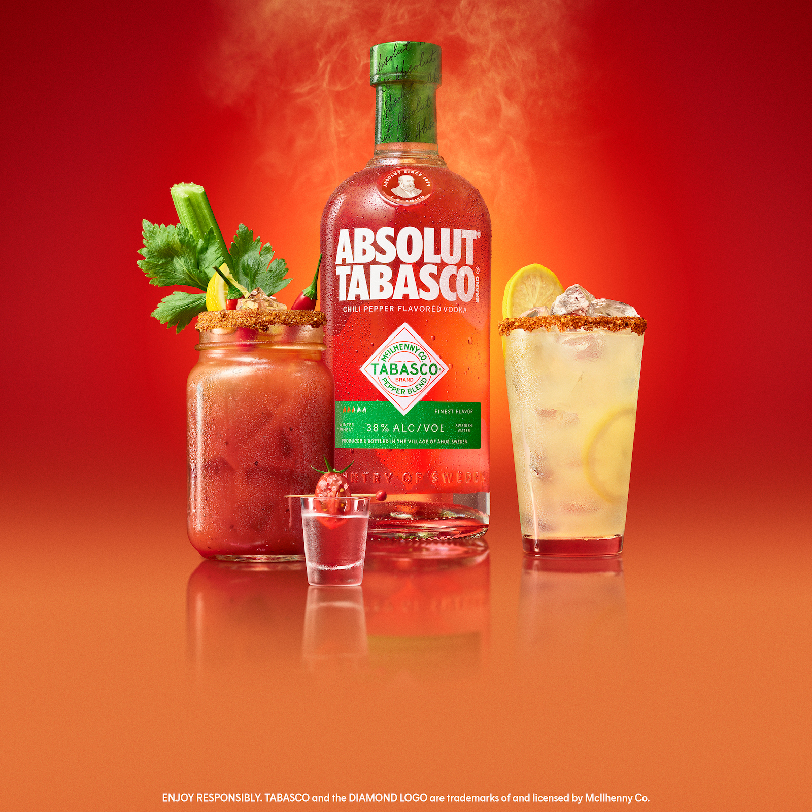 På flaskans framsida balanseras Absoluts screentryckta typografi med Tabascos klassiska diamantlogotyp, som sitter på en transparent självhäftande etikett. Absoluts logotyp behåller sin traditionella placering på flaskans övre del, medan Tabasco-diamanten tar plats på den nedre delen.