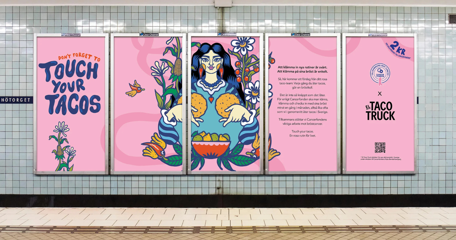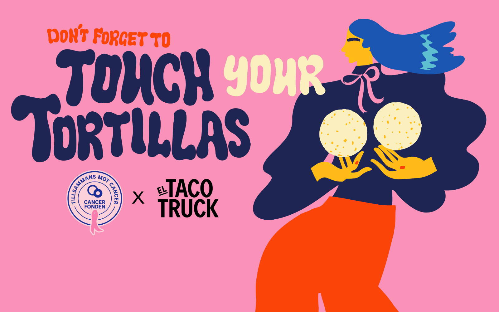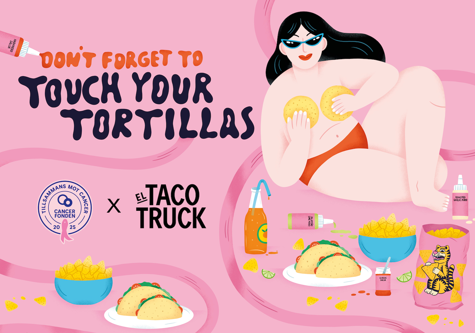 För tredje året i rad kör El Taco Truck sin Rosa Bandet-kampanj ”Touch Your Tortillas”. Kampanjen är ett samarbete med Cancerfonden i syfte att undersöka sina bröst för att upptäcka eventuella förändringar i tid. I år är det Karin Söderquist som står för illustrationen som ska förmedla det allvarliga genom lust och humor.