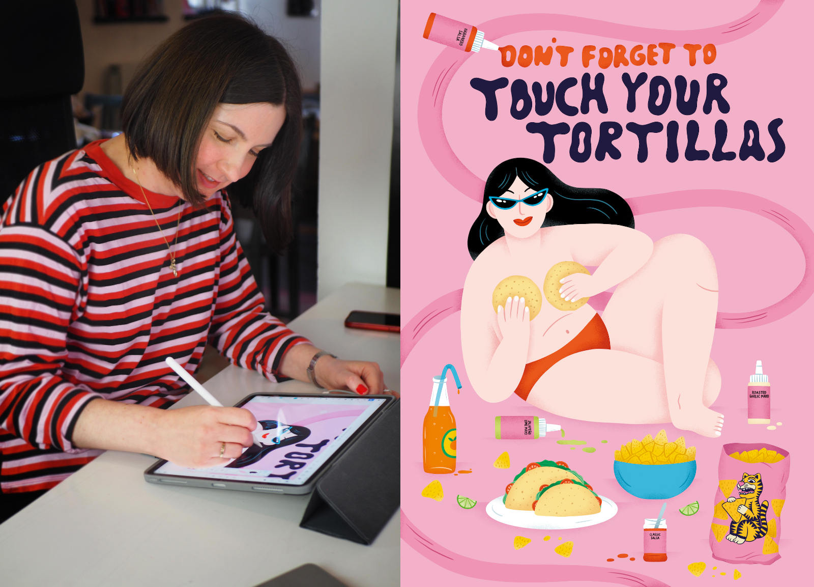 Årets ”Touch Your Tortillas”-illustration tycker hon speglar en riktigt bra tacomiddag: avslappnad, kladdig och lite stökig.