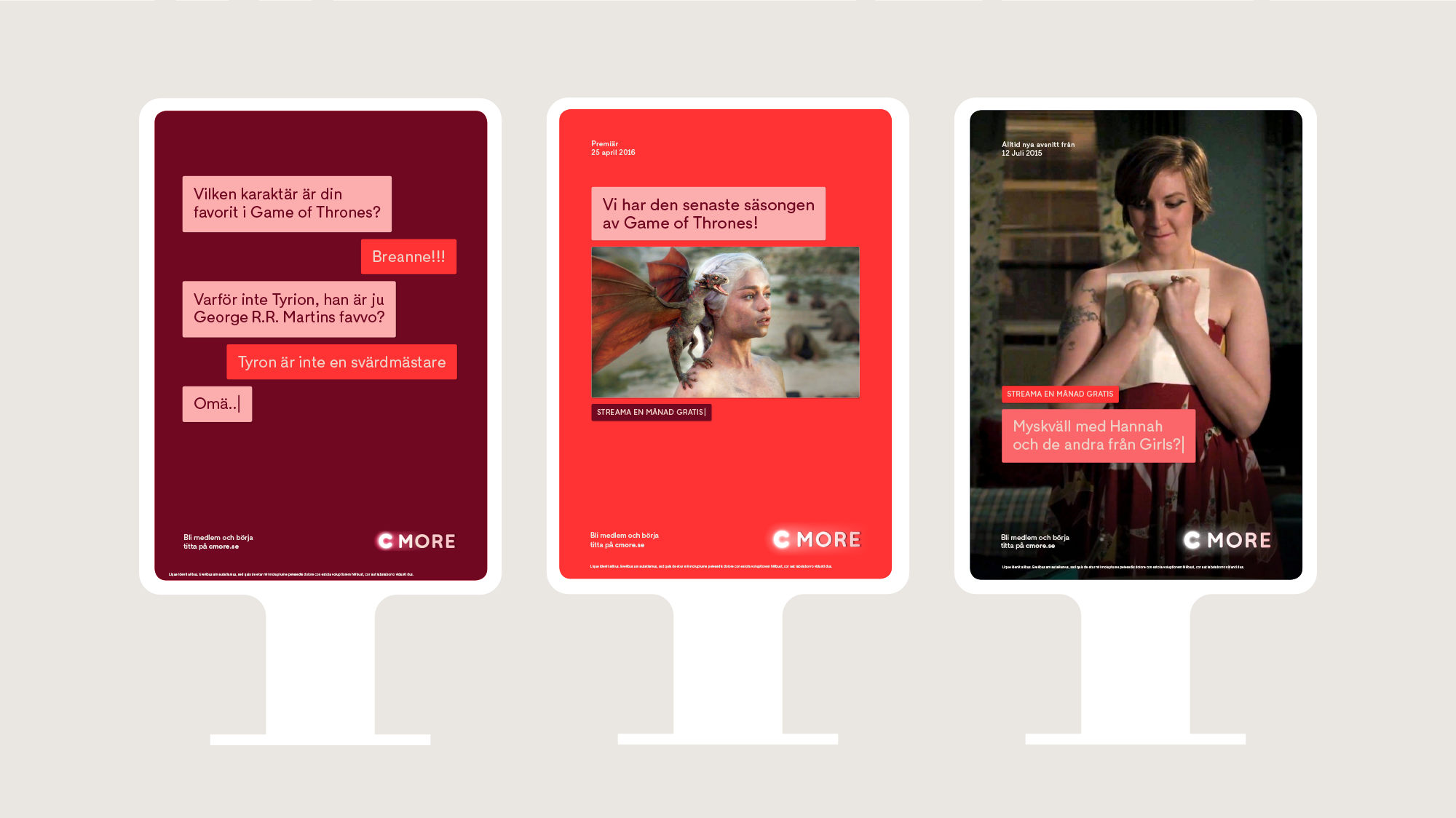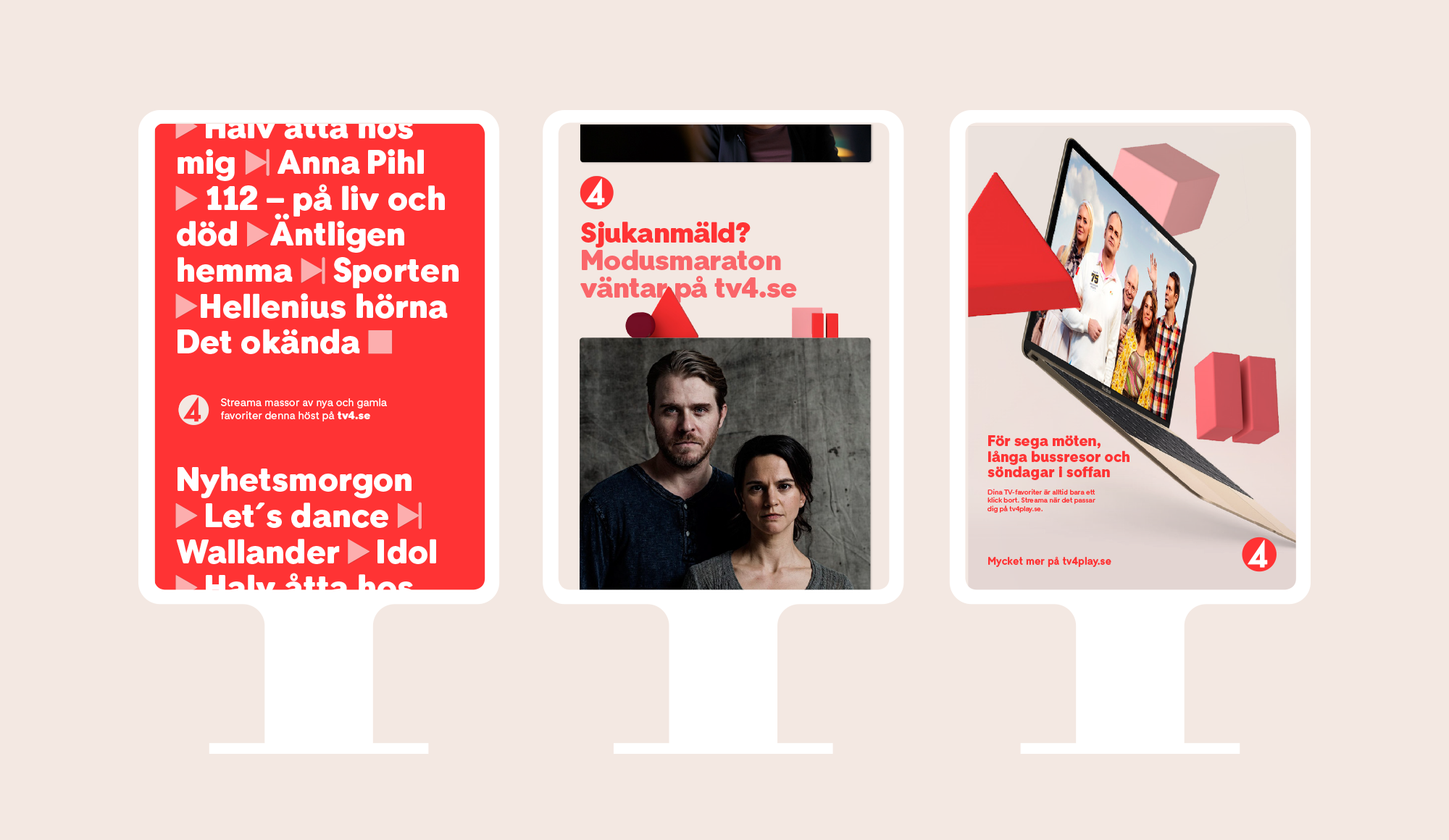 TV4-Gruppen ville samla flera av sina varumärken under ett paraply – och samtidigt rusta för en framtid där majoriteten streamar istället för att titta på linjär-tv. Resultatet är tre mänskliga identiteter, med en gemensam plattform. Här ser vi C More och TV4 Play.
