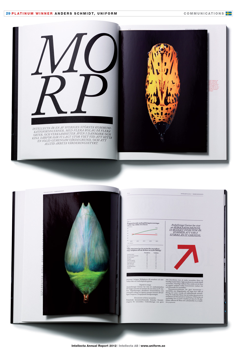 [fakta id=”42481″]Intellectas årsredovisning har sex olika omslag med sex olika puppor, steget mellan två livsformer. Temat för årsredovisningen, som är tryckt i matt lack på de glansiga ytorna, är Metamorphos. Morp-delen av ordet är en förkortning av företagets värderingar: mod, omtanke, resultat, passion.
