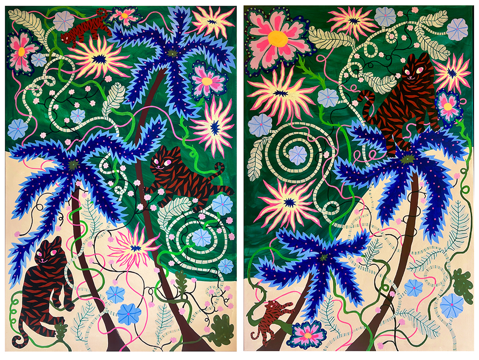 – Min kreativa process är intuitiv och fysisk. Jag jobbar mycket med rytm, upprepning och flöde, snarare än med färdiga narrativ. Jag börjar ofta med färg, sen växer formen genom själva görandet.